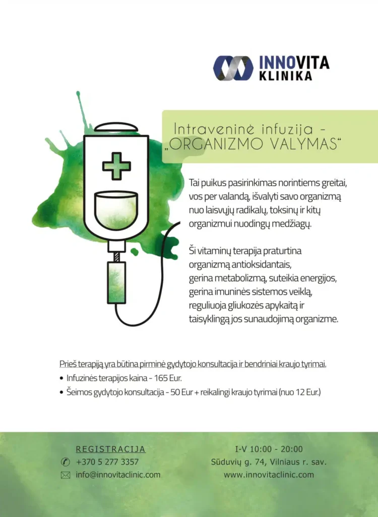 Intraveninė vitaminų infuzija „Organizmo valymas“ – tai efektyvus būdas greitai, vos per vieną valandą, padėti organizmui atsikratyti laisvųjų radikalų, toksinų ir kitų organizmui kenksmingų medžiagų.